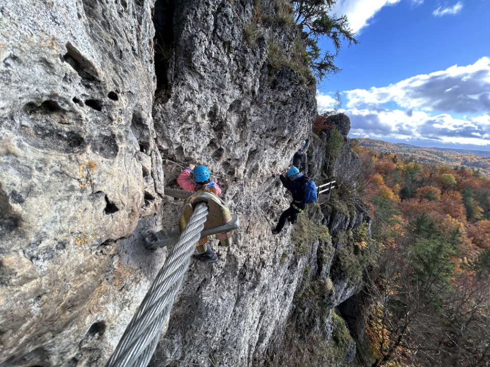 Der „Höhenglücksteig“ liegt in der wunderschönen Hersbrucker Alb und bietet Kletterpassagen verschiedener Schwierigkeitsstufen, die in 3 Teilabschnitten begangen werden können. In einer faszinierenden landschaftlichen Umgebung sind die Teilnehmer/innen während des Kletterns an einem Drahtseil gesichert.