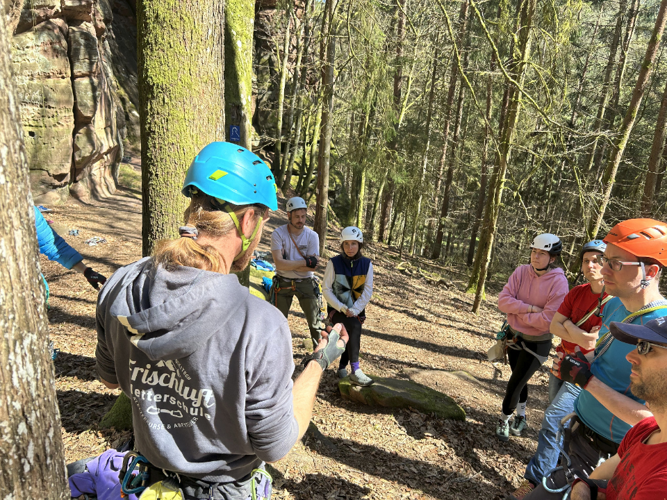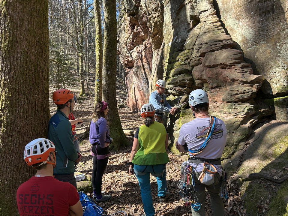Die Kletterzeit wollen dazu nutzen, um uns sicher in den typischen Sandsteinrissen bewegen zu können, sollten aber auch in der Lage sein, die Risse „vernünftig“ absichern zu können. Natürlich gehört ein Gipfelerlebnis in der Pfalz auch dazu, dafür schauen wir uns den Standplatzbau an und wie wir sicher wieder vom Gipfel runter kommen (Abseilen). Neben vielen Klettermetern im Sandstein werden wir auch die typisch Pfälzer Küche genießen und zusammen eine Weinschorle trinken auf die gemeinsam erlebten Klettermeter.